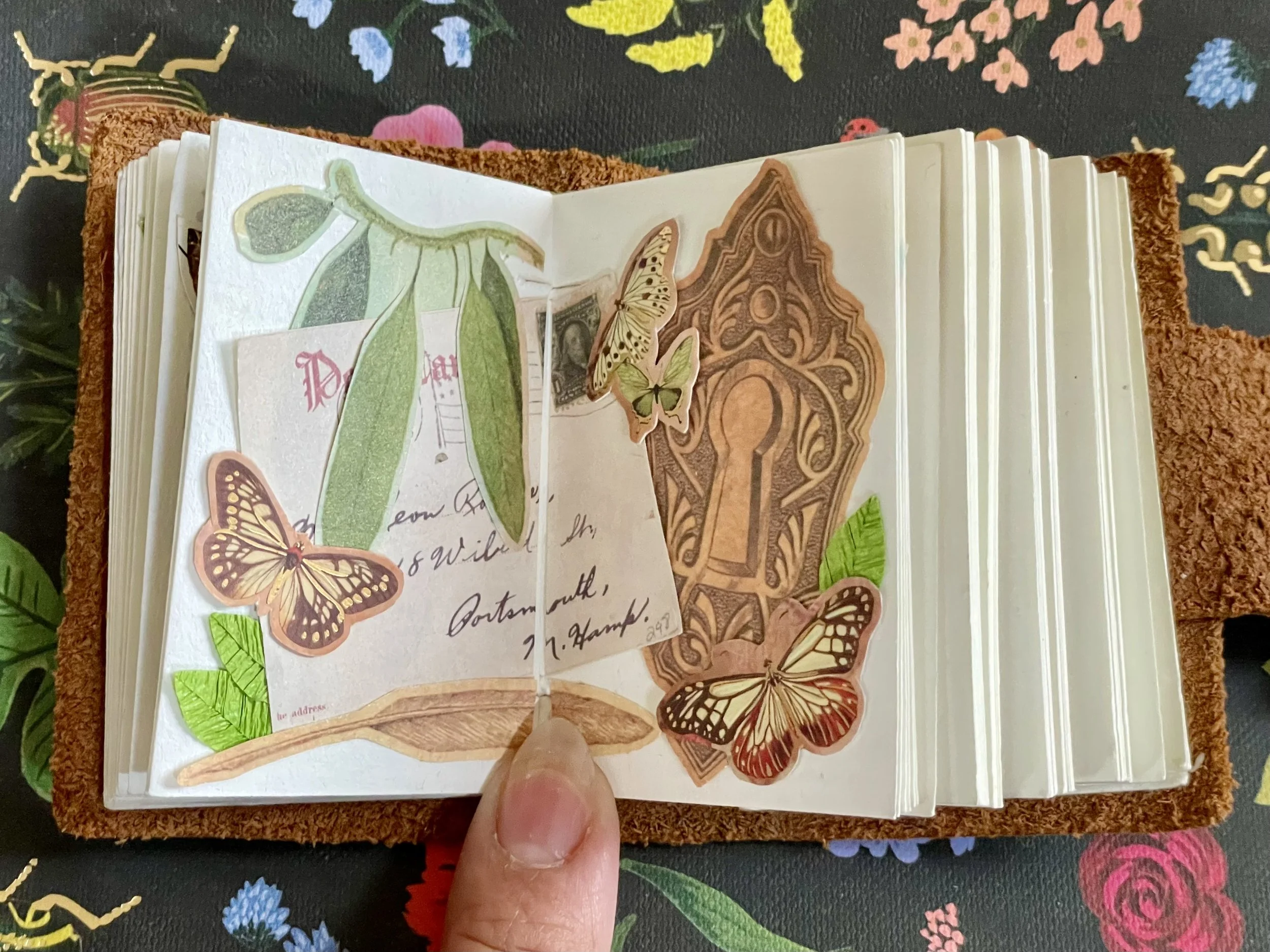 Alt: Ephemera and nature pieces overlap: long leaves on a vine drape over a small printed postcard with handwriting above a feather quill. An ornate keyhole plate sits on the right page, with butterflies and a tiny green leaf clustered around it.