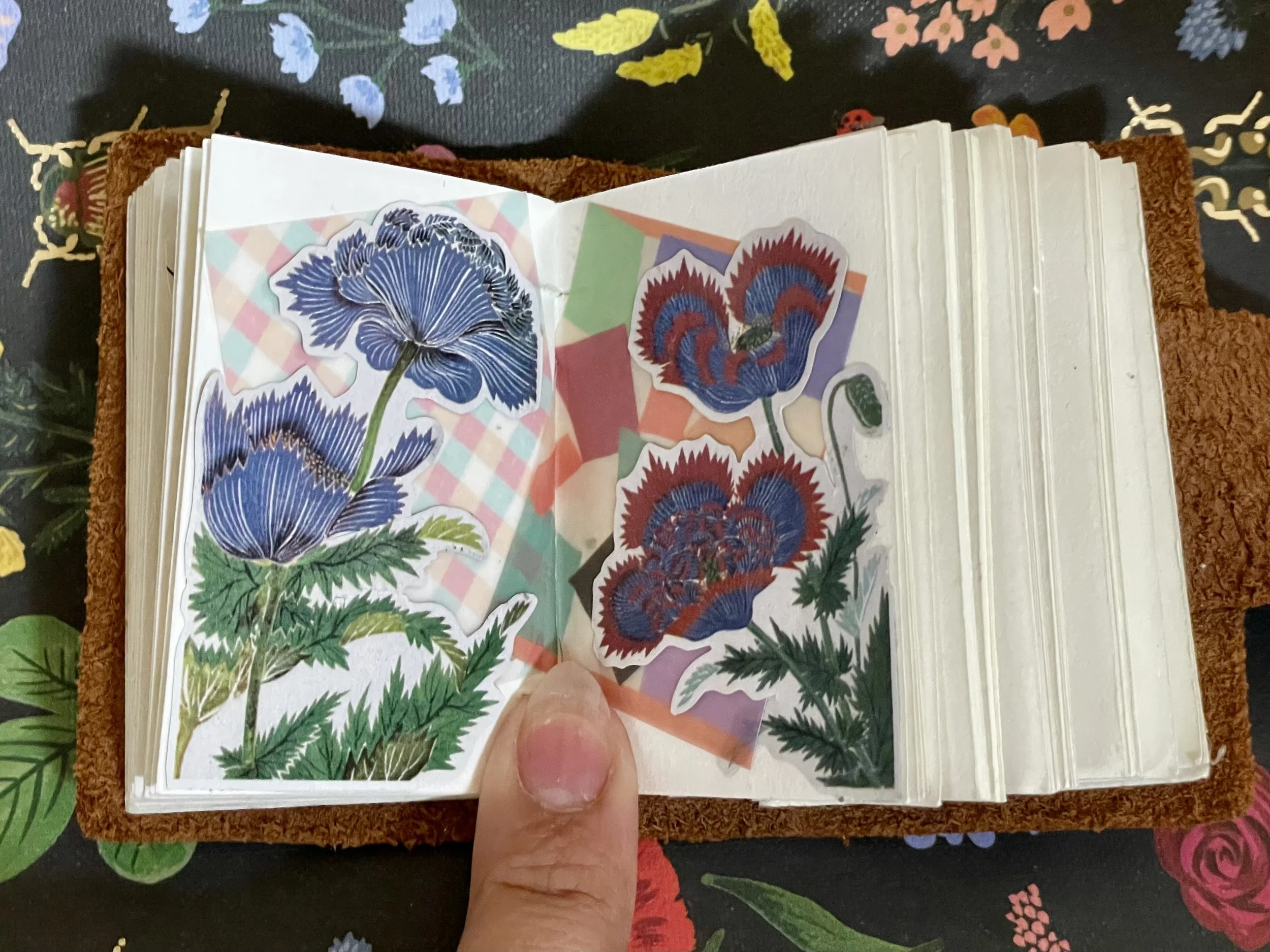 Alt: Large botanical stickers show blue poppy-like flowers with serrated leaves on the left page. The right page mirrors the theme with three red-and-blue feathery blossoms over pastel geometric backings. The composition pairs bold flowers with soft checkered and color-blocked grounds.