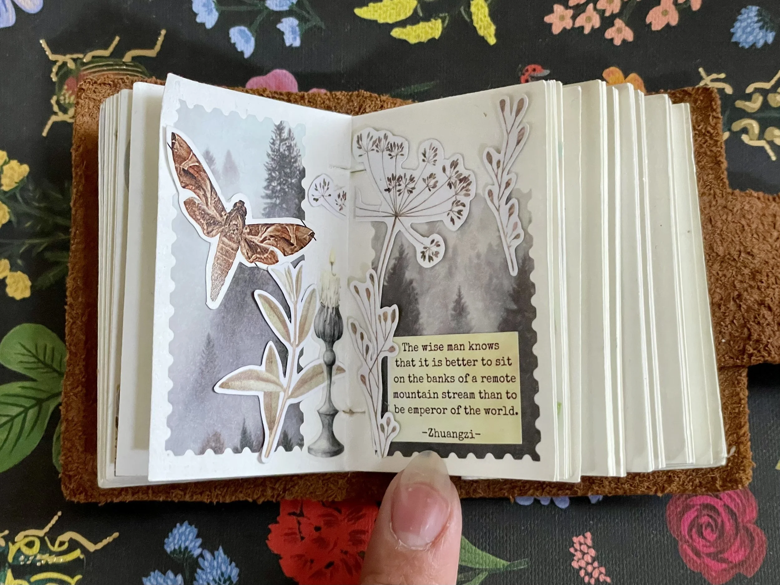 Alt: A moth and botanical cutouts frame a grayscale woodland scene in a scalloped border. On the right, pale woodland silhouettes surround a quote card: "The wise man knows that it is better to sit on the banks of a remote mountain stream than to be emperor of the world. —Zhuangzi." A candle and seedpod shapes accent the spread.
