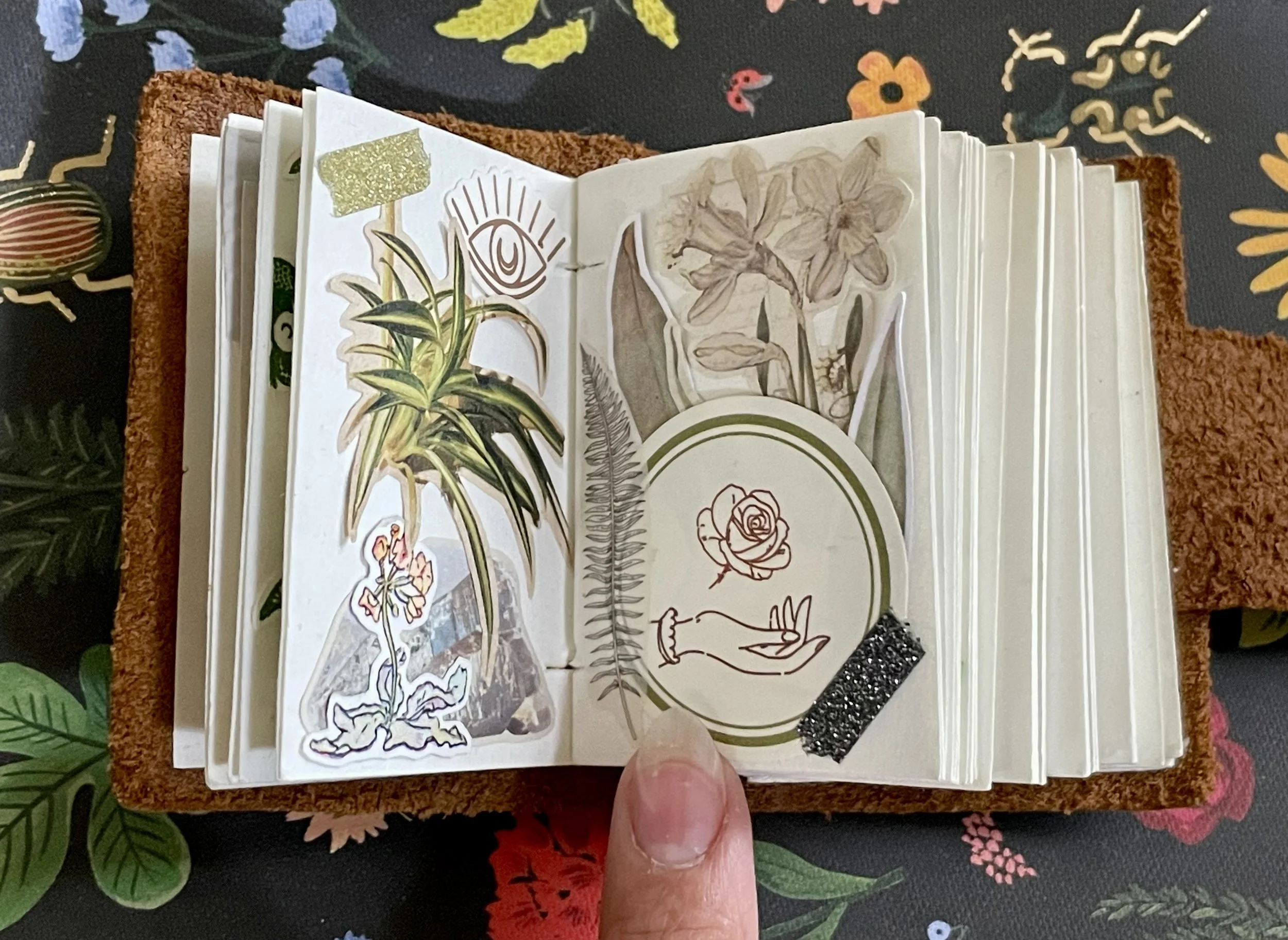 Alt: The left page combines a houseplant and eye motif above stones and a tiny blooming sprig. On the right page, sepia-toned flowers, a fern, and a circular emblem with a rose over an open hand are layered together, secured with a strip of dark “tape.” The elements feel botanical and slightly mystical.