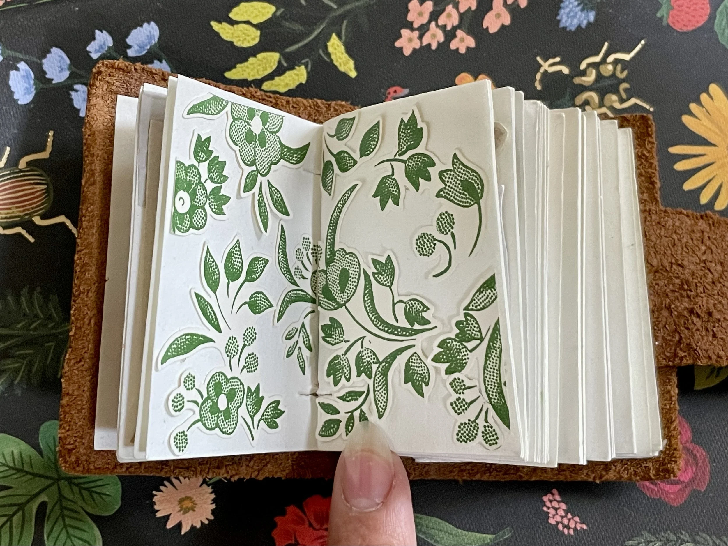Alt: Both pages are filled with raised green botanical motifs. Stylized vines, leaves, and small blossoms curve across the spread in a repeating pattern. The shapes are crisp and decorative, like an ornamental print.
