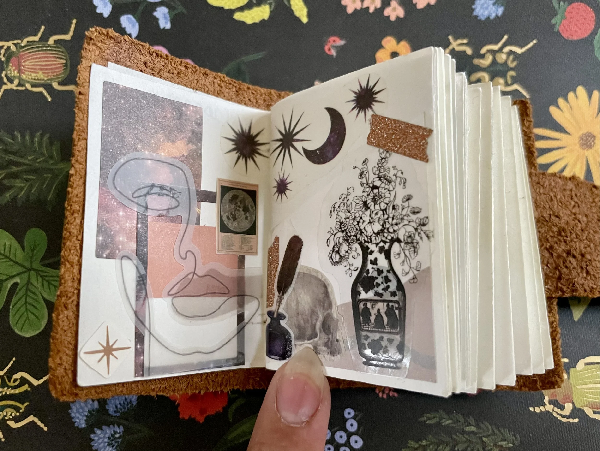 Alt: A collage of cosmic-themed stickers shows a crescent moon, starbursts, and a small image of the moon arranged above a black-and-white vase of flowers. A translucent line-drawn face overlaps blocks of pink and space textures on the left page, with a tiny ink bottle and a skull silhouette near the bottom.